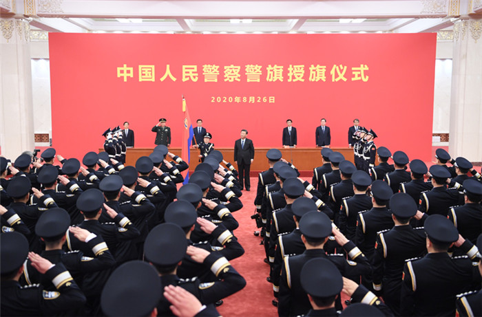 新华社北京8月26日电中国人民警察警旗授旗仪式26日在人民大会堂举行。中共中央总书记、国家主席、中央军委主席习近平向中国人民警察队伍授旗并致训词,代表党中央向全体人民警察致以热烈的祝贺。他强调,我国人民警察是国家重要的治安行政和刑事司法力量,主要任务是维护国家安全,维护社会治安秩序,保护公民人身安全、人身自由、合法财产,保护公共财产,预防、制止、惩治违法犯罪。新的历史条件下,我国人民警察要对党忠诚、服务人民、执法公正、纪律严明,全心全意为增强人民群众获得感、幸福感、安全感而努力工作,坚决完成党和人民赋予的使命任务。